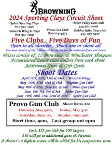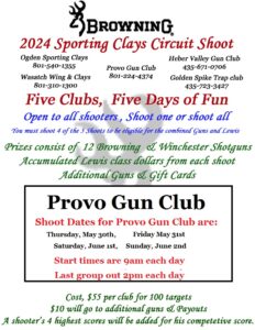 5 Clubs in 5 Days of fun. The clubs that are coming together for this event are Ogden Sporting Clays, Wasatch Wing & Clays, Provo Gun Club, Heber Valley Gun Club, and Golden Spike Trap Club.