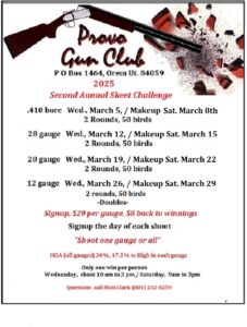 .410 bore Wednesday, March 5, 2025/ Makeup is on Sat. March. 8, 2025 2 rounds, 50 birds